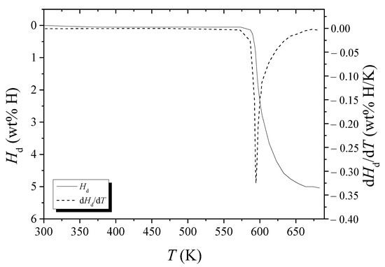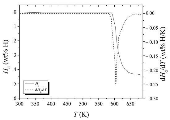 Figure 8 shows the variations with temperature, T, of Hd and dHd/dT under 1.0 bar H2 for hydrogenated Mg-5Ni. The sample was heated with a heating rate of 12 K/min. The dHd/dT begins to increase after about 590 K, is the highest at about 605 K, and becomes very low after about 663 K.