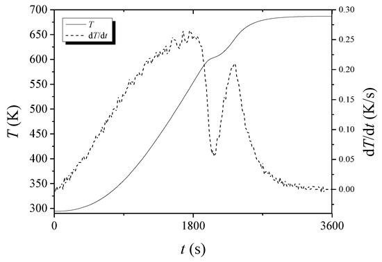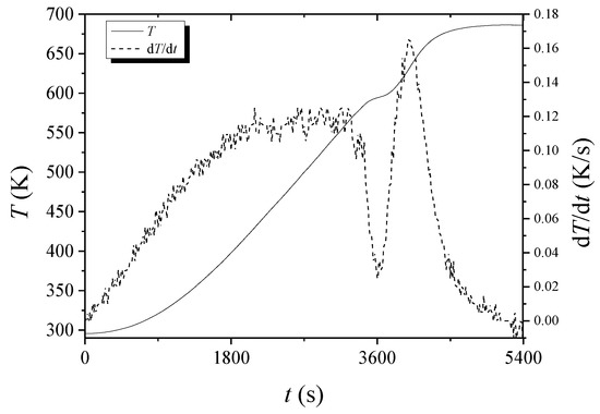 In the dT/dt versus t curves of Figure 10 and Figure 11, dT/dt decreases after about 625 K and 635 K, respectively. This decrease in dT/dt is due to a slower increase in temperature (according to the smaller power supply of the temperature controller) as the temperature reaches the upper limit set. The upper limit of temperature set by the program in the temperature controller was 673 K.