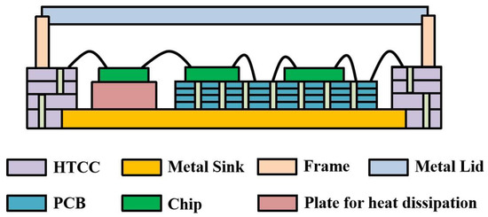 The schematic diagram of the SIP structure is shown in Figure 1. The HTCC substrate with internal vias is at the edge of the QFN package, and the metal heat sink is at the bottom of the HTCC shell. Inside the package, the molybdenum copper plate was used below the power chip to conduct heat away, and the multi-layer printed circuit board (PCB) was used as the carrier of the power modulation chip, which is implemented by the CMOS process. The upper lid of the shell was made of iron–nickel alloy material with a thickness of 0.25 mm, except the edge thickness was 0.1 mm. The microwave monolithic integrated circuits in the SIP included five bidirectional amplifiers with a thickness of 0.1 mm, and an amplitude-phase multi-function chip with a thickness of 0.1 mm. The analog integrated circuits included two power modulation chips with a thickness of 0.3 mm. The heat dissipation plate and the multi-layer PCB were located on the metal heat sink of the package. Five bidirectional amplifier chips with heat dissipation requirements were mounted on the plate. Multi-function chips and two power modulation chips were mounted on the PCB. The chips and the shell were electrically connected through gold wires and the PCB.