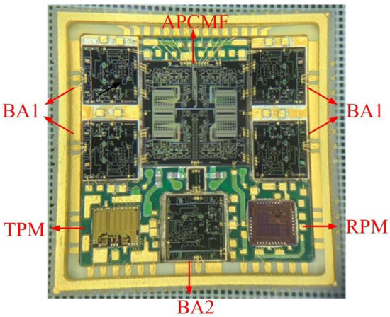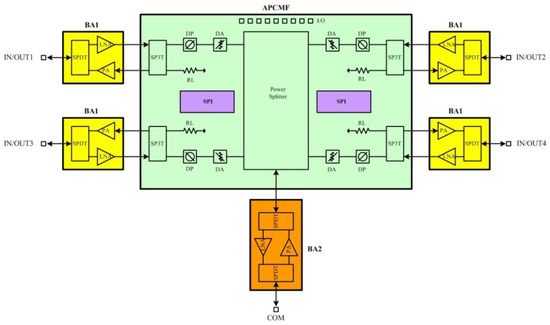 The system diagram of the SIP, which operates at 14.5–16.5 GHz, is shown in Figure 2. The Ku-band four-channel microwave chips were all implemented with a 0.25 um GaAs process, which has the advantages of lower noise figure and higher output power, including four BA1, one APCMF, and one BA2. The BA1 integrates a low-noise amplifier, a power amplifier, and a single-pole double-throw switch. The low-noise amplifier has a noise figure of 1.5 dB. The power amplifier has a saturation output power of 28 dBm and power-added efficiency of 38%. The single-pole double-throw switch has an insertion loss of 0.8 dB and high linearity characteristics, which has an output 0.1 dB compression point of 29.5 dBm. The BA2 integrates a low-noise amplifier (LNA), a power amplifier (PA), and two SPDT switches, which use the same PA, LNA switch as BA1. The APCMF integrates a serial-parallel conversion circuit (SPI), a four-way power divider, four 6-bit digital attenuators, four 6-bit digital phase shifters, and four single pole three throw switches. The SPI has the advantage of reducing the interface of control bits. The 6-bit digital attenuator has a 0.5 dB step size, 31.5 dB attenuation range, and attenuation accuracy RMS of 0.2 dB. The 6-bit digital phase shifter has a 5.625° step size and phase shift accuracy RMS of 3°. The single pole three throw switch includes three states of receive, transmit, and load. It is very convenient for single-channel measurement and performance evaluation.