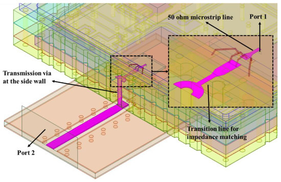 For electrical characteristics, to simulate the microwave performance of the SIP more accurately, first of all, it was modeled with high precision [37,38]. Based on the High Frequency Structure Simulator (HFSS) software for 3D electromagnetic field simulation, the model of the main microwave transmission path of the SIP was established, as shown in Figure 3. The transmission path was from the chip pad, bonding wire, HTCC shell (including the transmission via at the side wall) to the PCB board. The solution type in HFSS was set as driven modal. The port 1 for excitation was set as a lumped port, and the port 2 was set as a wave port. Between the port 1 and the signal pad of the chip, there was a microstrip line of 50 ohm and a tapered line. The transition line shown in Figure 3 was used for impedance matching. The diameter and spacing of the transmission vias at the side wall were also optimized to reduce impedance discontinuity. The size of the microwave signal pad was 150 × 100 µm2, and the bonding wire adopted two parallel wires with a length of 400 µm. The substrate of the microwave chip was set as gallium arsenide (GaAs) with a dielectric constant of 12.9.