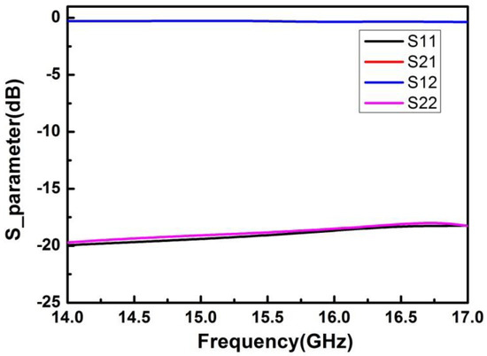 The simulation results of S-parameters are shown in Figure 4. It can be seen from the results that the insertion loss (S21) of the microwave transmission path was about 0.3 dB, and the return loss (S11/S22) was less than −18 dB in the 14.5–6.5 GHz frequency range.
