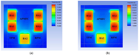 According to the demands of the working radar system, the maximum transmission pulse width was 3 ms, and the maximum duty cycle was 30%. The thermal characteristics of the SIP were simulated with the actual heat dissipation of the chips [40,41], as shown in Figure 6a. The simulation was based on the Ansys Icepak software. In the simulation, the package was on the plate with a fixed temperature of 70 °C, and the heat dissipation of the chips BA1 and BA2 was set as 1.7 W, respectively. For comparison, the result of another SIP without a heat sink and gasket is shown in Figure 6b, which means that all chips were mounted on the HTCC shell directly. The thermal resistances between the chips and the packages were computed to be 0.86 °C/W and 8.96 °C/W for Figure 6a,b. These results indicate that the SIP with a heat sink and gasket had a better ability for heat dissipation.
