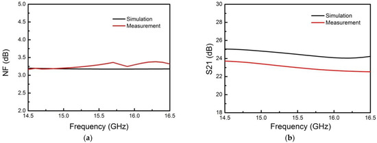 Figure 9. Comparison of simulation and measurement of the proposed Ku-band SIP in receiving state. (a) Simulated and measured noise figure curve; (b) Simulated and measured linear gain curve.