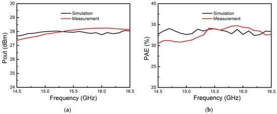 Figure 10. Comparison of simulation and measurement of the proposed Ku-band SIP in transmitting state. (a) Simulated and measured saturated output power curve; (b) Simulated and measured power added efficiency curve.