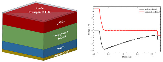where EInGaN is the ternary alloy bandgap, EInN is the Indium nitride bandgap, EGaN is the gallium nitride bandgap, and b is the bowing factor. In this work, b = 1.348 is considered according to ref. [54]. Since graded bandgap has been modeled, it has been simulated that a high-to-low energy ramp in the absorption layer is the best approach to improving the collection of photogenerated carriers [55,56]. The highly strained materials are obtained by grading the absorption InGaN-based layer, reducing the dislocations and phase separation [57].