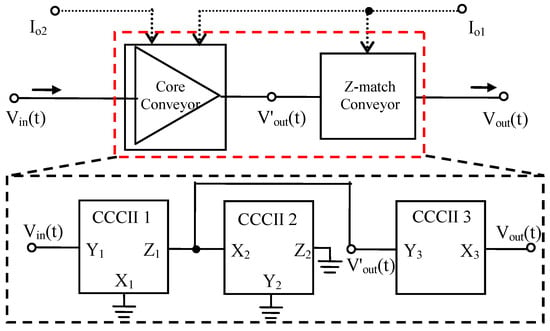 The CCCII is an increasingly popular building block for RF functions [,,]. The CCCII can be used to design a gain-controllable LNA, the gain of which can be controlled by the DC biasing current Io. For the realization of this LNA, three different CCCIIs, as the main building blocks, which are symbolized as CCCII 1 to CCCII 3, can provide voltage signal amplification and wideband output impedance matching when connected, as shown in Figure 2. The current conveyor CCCII 1 converts the input voltage signal into a current signal, the connection of the two current conveyors, CCCII 1 and CCCII 2, amplify this current signal, and the current conveyor CCCII 2 converts the amplified current signal into the output voltage signal. Besides, the current conveyor CCCII 3 is the Z-match block on the output of the LNA, which adjusts the output impedance of the LNA to an ideal value.