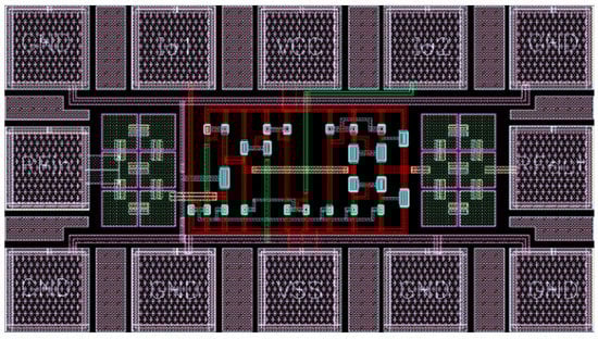 The proposed wideband LNA has been realized using a GlobalFoundries’ 0.18 μm single-poly six-metal CMOS technology and simulated using Cadence SpectreRF simulator. The GlobalFoundries’ Design Rule (YI-093-DR001_Rev1V_1.8V-3.3V) and GlobalFoundries’ Spice Model spec (yi093dr001_1v_00_20090731a) are used. During the design process, a very important step is the realization of the layout. To maximize RF performance, the layout was made by following classical design rules commonly used for analogue RF circuit synthesis (e.g., transistor matching, symmetric design, etc.). In order to validate the design approach, optimization of biasing currents and width of transistors with extensive DC analysis are simulated. The layout of the proposed wideband LNA is presented in Figure 4, which takes an active chip area, including testing pads of 0.42 mm × 0.23 mm. The absence of inductor components results in a very small chip area (0.096 mm2).