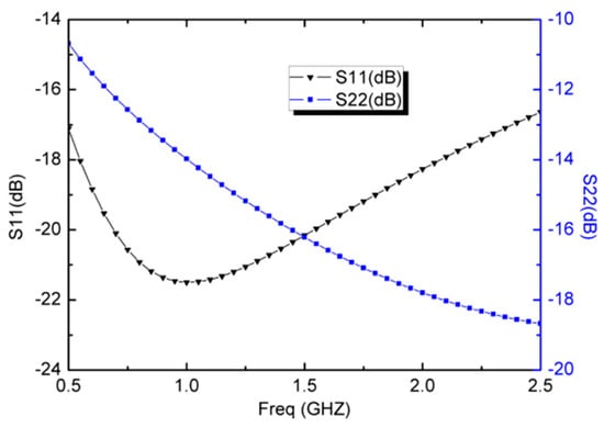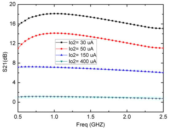 Figure 5 presents the simulated input return loss (S11) with Io1 = 1.25 mA, Io2 = 50 μA, and VDC = ±1.5 V. At a frequency of 1.0 GHz, S11 has a value of −21.4 dB and it remains below −16.6 dB for frequencies from 0.5 GHz to 2.5 GHz. As a critical parameter of the LNA, the S11 provides a good wideband input matching performance without the LC matching network. Figure 5 also presents the simulated output return loss (S22), which uses the translinear CCCII 3 in voltage follower mode as the output impedance matching circuit. The simulated S22 is from −10.6 dB to −18.6 dB over the entire frequency band of 0.5~2.5 GHz, indicating a reasonably acceptable output matching condition.