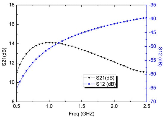 As described by Equations (6) and (7), the voltage gain increased and bandwidth decreased when Io2 decreased. In order to control the LNA performance over the 0.5~2.5 GHz bandwidth of interest, the currents Io1 and Io2 are fixed at 1.25 mA and 50 μA for this design. Under these conditions, the typical voltage gain (S21) and reverse isolation (S12) performances are present in Figure 7. The simulated S21 shows a typical voltage gain of 12.6 dB with a gain ripple of ±1.5 dB from 0.5 GHz to 2.5 GHz. According to Figure 7, the simulated S12 is from −65.2 dB to −39.5 dB in the required band, which indicates that the designed LNA can achieve a good stability characteristic. The better S12 can decrease the subsequent local oscillation (LO) leakage, arising from the substrate coupling and the capacitive paths.