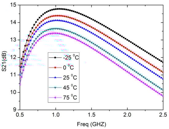 As shown in Figure 8, the proposed wideband LNA is simulated for different temperatures and corner processes. The wideband LNA designed here has an excellent thermal stability: in the temperature range of −25 °C to 75 °C, the gain S21 drops about by ±1 dB. As the temperature increases, the gain S21 of the wideband LNA gradually decreases.