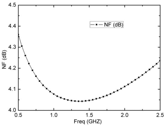Owing to noise concerns, Figure 9 shows the simulated NF of the wideband LNA with Io1 = 1.25 mA and Io2 = 50 μA. It has a relatively flat and low NF performance across the entire 2 GHz bandwidth. From Figure 9, an excellent NF of 4.05~4.35 dB in the frequency range of 0.5~2.5 GHz is achieved. The maximum NF is 4.35 dB at 0.5 GHz and the minimum NF is 4.05 dB at 1.5 GHz, with an average NF of 4.2 dB.