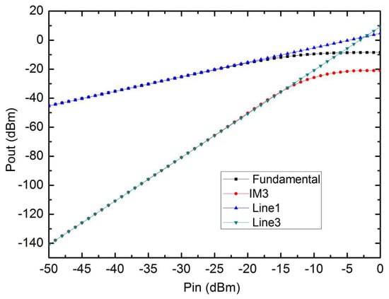 To observe the nonlinear behavior, the two-tone signals at 1.50 GHz and 1.51 GHz with equal power levels are applied to the wideband LNA. The two-tone signals with 10 MHz spacing are used to simulate the fundamental and third-order inter-modulation (IM3) output power, versus input power, characteristics. As shown in Figure 10, an input third-order intercept point (IIP3) of −2.5 dBm and an input 1 dB compression point of −12.5 dBm are achieved. These results show that the designed LNA can achieve good linearity even with the low NF.
