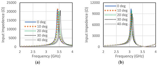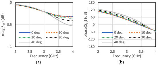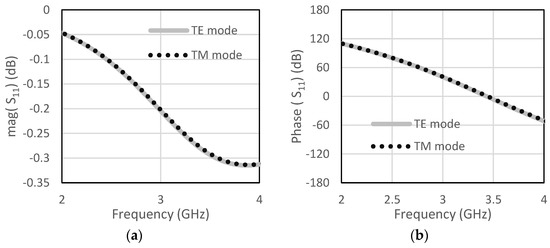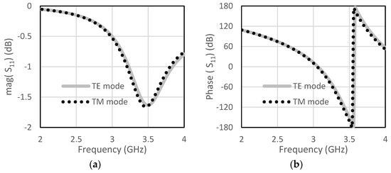 The unit cell for the proposed RIS was designed at the center frequency of 3.5 GHz. The size of the unit cell was 42 mm × 42 mm. A low-cost FR4 substrate with a thickness of 1.6 mm, loss tangent of 0.002, and dielectric constant of 4.4 was considered for our design. The single-element unit cell was taken as a base element for the RIS design. Initially, a circular patch with a radius of 10 mm was taken on the FR4 substrate, as shown in Figure 1a. There was a copper plate below 10 mm from the dielectric for the reflections of the incoming waves. This type of unit cell was considered for the RIS design due to its simple construction and low cost. The circular-type patch and the circular type-patch with a ring were chosen to make the structure polarization independent. Polarization-mismatch related losses can be overcome using this type of polarization-independent structure. Figure 1b shows the circular patch with a circular type of ring to achieve a similar type of magnitude of the reflection coefficient, but almost 180° shifted phase. The magnitude and phase of the S11 parameters for the unit cell of circular type patch are shown in Figure 2a,b, respectively, for both the TE and TM mode. The polarization-independent nature of the unit cell can be verified from their modes. It was observed from Figure 2 that the magnitude of the reflection coefficient was −0.29 dB for both TE and TM modes at 3.5 GHz. The phase of the reflection coefficient was −5° for both TE and TM modes at 3.5 GHz. Figure 3a,b show the magnitude and phase of the reflection coefficient at 3.5 GHz for both TE and TM modes. The magnitude and phase of the reflection coefficient were −1.6 dB and −152°, respectively, for both TE and TM modes. The performance of the unit cells under different angles is a very important factor. The performances of unit cells under incidence angle of 0°,10°, 20°,30°, and 40° has been presented here for both types of unit cells. Figure 4a,b show the magnitude and phase of the circular type of patch unit cell for 0°,10°, 20°,30°, and 40° angles of incidences. It can be observed from these Figures that there are no significant changes in the performances of the unit cells under the different angles of incidence. Figure 5a,b show the magnitude and phase of the circular type of patch with a ring unit cell for 0°,10°, 20°,30°, and 40° angles of incidences. In this case, the performances of the unit cell were also not changed significantly. Input impedances of the circular type of unit cell and circular type of unit cell with a ring are presented in Figure 6a,b, respectively.