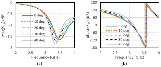 Circular type of patch (a) magnitude of S11 for different angles of incidence (b) phase of S11 for different angles of incidence.