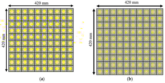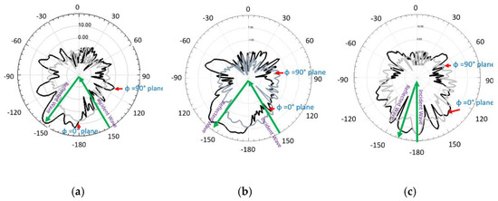 To check the radiation performance of the unit cells, we took the arrays of the 10×10-unit cells shown in Figure 7. Figure 7a shows the circular patch type 10×10-unit cells while Figure 7b and Figure 8 show the circular type of patch with a ring 10×10-unit cells and the combined type of the 10×10-unit cells array, respectively. Standard horn antennas working at 3.5 GHz were in our design. The radiation from the standard horn antenna was impinging upon the 10×10-unit cells. We studied the reflected radiation patterns for the 10×10 circular patch array, 10×10 circular path with ring array, and 10×10 combined array. It is noted that the radiation pattern performances for these types of arrays are not very important. We have still included the radiation patterns for all those arrays. The real-time communication performances using those arrays are very important to study for such types of arrays. However, in this paper, the real-time performances using communications links are not presented. To check the radiation performances of these arrays, a standard horn antenna working at 3.5 GHz was considered. For the 10×10 circular patch type array, there was a transmitting horn antenna which was placed at an angle of 30° from the array. The waves were impinging on the surface of the arrays and were reflecting from the surface. To collect the reflected signal from the array, a receiving horn antenna was placed at −30° with the array. The same procedure was followed for the 10×10 circular patch type with a ring array. However, for the combined 10×10 arrays, the transmitting horn antenna was placed at an angle of 0° to the combined 10×10 arrays while the receiving antenna was at a certain angle. Figure 9a shows the reflected radiation pattern from the 10×10 circular type of array, while Figure 9b,c show the reflected radiation patterns from the 10×10 circular type with a ring array and the combined array, respectively. The peak gain of the incident pattern was 13.2 dBi for both φ = 0° and φ = 90° planes for all three cases. The peak gains for the reflected patterns for the circular type of patch and circular type of patch with a ring were 11.2 dBi and 18.1 dBi, respectively. The proposed fabricated arrays are shown in Figure 10. Figure 10a–c show the fabricated 10×10 circular type patch type of arrays, circular type of array with a ring, and combined structure, respectively.