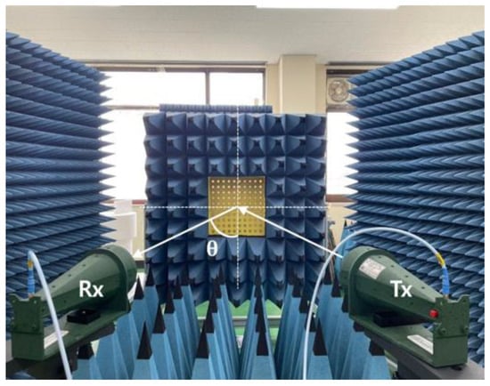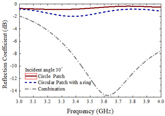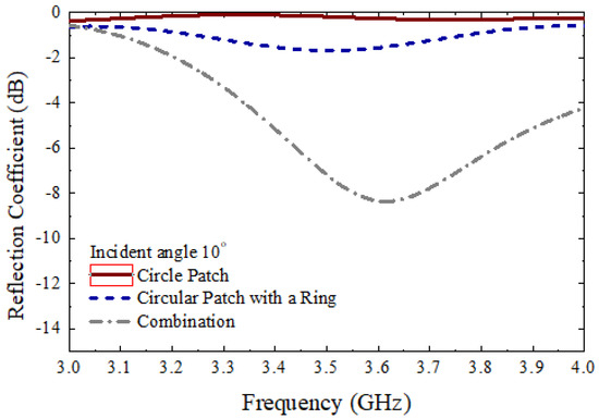 Figure 11 shows the measurement setup to measure the different parameters. The proposed 10×10 circular type patch array or the 10×10 circular path array with a ring, or the 10×10 combined array can be placed middle of the main absorbing material, as shown in Figure 11. There were several absorbers left side and right side of the main absorber. Additionally, there were absorbers on the ground. The purpose of adding more absorbers is to reduce the unwanted radiation from outside as well as reduce the reflection from the wall of the room. As shown in Figure 11, two standard horn antennas working at 3.5 GHz were considered to measure the different parameters of the 10×10 arrays. The antennas were connected to the vector network analyzer (VNA) to measure the reflection coefficients of the proposed arrays. To measure the reflection coefficients of three types of 10×10 arrays, initially, the transmitting horn antenna was placed at an angle of 10°, and the received powers were measured using a similar type of horn antenna at an angle of −10°. Figure 12 shows the measured reflection coefficients for three different cases at an angle of incidence of 10°, while Figure 13 shows the reflection coefficients for three cases at an angle of incidence of 30°. It is to be noted that the reflection coefficients for the combined 10×10 array were very low. This is because the beam is steered at a different angle for the combined 10×10 array. To achieve an actual good reflection coefficient for the combined 10×10 array, the receiving horn antenna needs to be placed at the steered beam position. However, in this paper, this type of measurement was not performed. Initially, a 10×10 circular type patch was designed, and the performances of the 10×10 circular type patch were tested. From the 10×10 circular type patch, it was observed that the 10×10 patch was working as a good reflector. After that, a 10×10 circular type of patch with a ring was designed and the performance of the structure was tested. It was also observed that the 10×10 circular type of patch with a ring was working as a good reflector. The unit cell of the circular-type patch with a ring has a very significant phase difference from the phase of the unit cell of the circular type. By combining these two types of unit cells, it is possible to achieve a scanned beam. A 10×10 combined array was taken so that a well-scanned beam could be obtained from the structure.