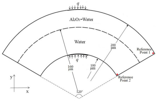 To validate the above model, numerical simulations of HMT in a 2D fan-shaped ring as shown in Figure 1 were performed. Al2O3 nanoparticles with a size of 20 nm and 5 wt%. The temperature of the heat source is set to 350 K. The domains occupied by both water and nanofluid are meshed, the number of grids is 6000, 12,000, 18,000 and 20,000, respectively. The corresponding Nusselt’s numbers differ by 2.1%, 0.71% and 0.69%, respectively. This signifies that the grid size of 12,000 is fine enough for the present simulations. In addition, appropriate CPU times of 45 min and 325 min correspond to 6000 and 20,000 grids. The simulations were performed in Fluent 17.0 with finite volume methods for discretization. The Soret and Dufour effects, can be taken into account by User Defined Functions (UDF), programmed in C language. A switch is set to call the UDFs for the Soret or Dufour effects so that the calculations for the individual Soret effects and Dufour effects, and both effects can be performed. Data collections are performed in each iteration, the variables are velocities, temperatures and mass fractions of nanofluid. Comparisons in Table 2 for different Rayleigh numbers with that in Reference [38] showed good agreement, the errors are less than 6.7%. This proves that the above model based on the Buongiorno model is valid.