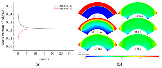 The mass fraction of reference point 1 and point 2 (a), and the diffusion process is evaluated by the concentration of nanoparticles at various times. The initial mass fraction of Al2O3 is 5 wt% (b).