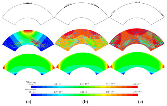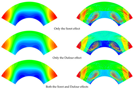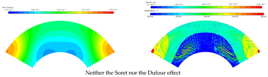 It is worth noting that the concentrations in Figure 4 for reference point 1 affected by the Soret effect are higher than that by both the Soret and Dufour effect when t < 6.6 s. Reversely, the concentration induced by the Soret effect is lower than that by both the Soret and Dufour effect when t > 6.6 s. The reason is that, during the first phase of the sharp decrease in the mass fraction at reference point 1, the presence of the temperature and concentration gradient causes the velocity in the flow field to increase and the concentration at reference point 1 to decrease. Figure 5 shows the flow field at t = 3 s for various cases. Concentration gradients promote the diffusion of nanoparticles at high concentrations, but the velocity decreases as the concentration gradient continues to decrease. Hence, in the absence of the Dufour effect and the Soret effect, the concentration gradient in the flow field will be minimal and its velocity will be, instead, minimal. Conversely, the concentration gradient is the largest and its velocity is the largest under the influence of the Soret effect.