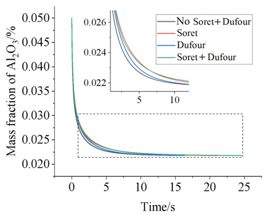 First, the mass fraction of Al2O3 at reference point 1 is analyzed for various cases, neither the Soret nor the Dufour effect, only the Soret effect, only the Dufour effect, and both the Soret and Dufour effects are considered. A 350 K heat source is arranged at the bottom-middle wall of the fan-shaped ring with a nanoparticle mass fraction of 5 wt%. Figure 4 shows that the Soret effect can produce a larger mass transfer than the Dufour effect. However, the effects of the Dufour and Soret effects on HMT are not simply additive, but combined and interfere. It is easy to understand that a larger mass transfer can be obtained when both the Soret and Dufour effects are considered than when neither the Soret nor the Dufour effects are considered.