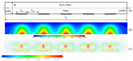 The geometry of microchannel with discrete heat sources (a), the temperature distribution in microchannel (b) and the flow velocity induced by heat sources (c) for q = 106 W/m2, initial mass fraction 4.0 wt%, initial temperature of fluids and walls 300 K.
