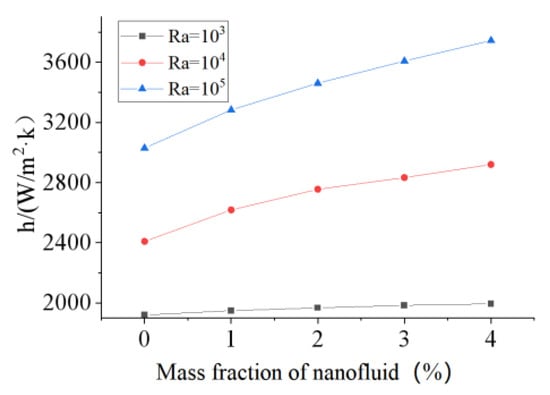 The heat transfer coefficients for various Rayleigh numbers 103, 104 and 105, and mass fractions 0–4 wt%.