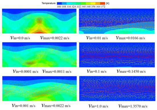 Then, the forced convective heat transfer for a variety of inlet velocities was studied. Figure 8 shows the temperature distributions together with velocity vectors for q = 5 × 105 W/m2 when the inlet velocities are 0.0, 0.001, 0.01, 0.1 and 1.0 m/s. For definiteness, the temperature profile in Figure 8 for zero inlet velocity is at t = 1 s, and the other profiles for inlet velocities 0.001, 0.01, 0.1 and 1.0 m/s are at steady state. Figure 8 demonstrates that there is a clear velocity perturbation at inflow velocities smaller than 0.001 m/s, since the maximum velocity in the fluid domain is of the order of 10−3 m/s and is nearly independent of the inlet velocity. Reversely, the maximum velocity is always related to the inlet velocity when the inlet velocity is greater than 0.01 m/s. In addition, the most important index, the maximum temperature on the wall where the heat source is located, is 370, 357, 352, 339, 313 and 304 K, respectively, at an inlet velocity of 0.0, 0.0001, 0.001, 0.01, 0.1 and 1.0 m/s. The highest temperatures on the wall with the heat source are listed in Table 4 for various q = 106, 5 × 105, 2 × 105 W/m2, and it is found that the inlet velocity vin = 0.01 m/s is suitable for all three cases with q = 106, 5 × 105, 2 × 105 W/m2 if the highest temperatures on the wall with heat source have to be lower than 353 K (80 °C).