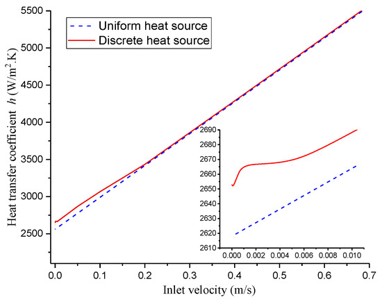 - The heat-transfer coefficient for the discrete heat source is substantially greater than that for the uniform heat source when the inlet velocity <0.01 m/s. It first rises and then falls for inlet velocities ranging from zero to 0.004 m/s, and continues to rise for inlet velocities larger than 0.004 m/s due to the presence of visible flow perturbations.