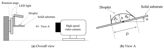 Figure 1 shows the schematic of the experimental apparatus. As shown in Figure 1a, the apparatus mainly consists of the high-speed video camera (HX-5, NAC Image Technology, Ltd., Tokyo, Japan), the rotation stage and the LED light. The solid sample is set on the rotation stage. The droplet is deposited on the solid substrate as shown in Figure 1b. After the deposition, the solid substrate is rotated with a constant angular velocity ω = 0.5 deg sec−1. Then, the droplet motion during the rotation was captured with the high-speed video camera. The geometrical parameters, such as the contact area diameter D, height h and advancing (θA) and receding (θR) contact angles were measured. In the present study, silicone rubber (SR) was used as the solid substrate. The surface roughness of SR is Ra = 0.02 μm [39]. The SR substrate is a kind of low-surface-energy solid, which enables us to make a stable droplet shape on solid surface with high reproducibility, unlike a high-surface-energy solid, such as a metal [40]. Then, water–ethanol binary mixtures were used for the liquid. The four mixtures with different ethanol mass concentrations were used: 0.072 Nm−1 (0 wt%), 0.051 Nm−1 (7.7 wt%), 0.038 Nm−1 (20.6 wt%) and 0.030 Nm−1 (39.3 wt%). The droplet volumes ranged from 7 to 600 μL. More detailed information on the droplets is listed in Table 1. In this experiment, the temperature and humidity were in the ranges of 20.0–25.0 °C and 50.0–55.0%, respectively. Each experimental condition was performed three times. The contact angles of droplet were measured using commercial software (FAMAS; Kyowa Interface Science Co., Ltd., Saitama, Japan). Figure 2 shows the images of the droplet wettability on SR. The apparent contact angle decreases as the ethanol concentration increases. Here, the droplet volume is 10 μL in each liquid.