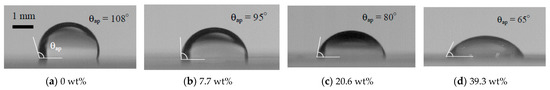 Droplet wettability of each liquid on silicone rubber (SR): (a) 0 wt% (0.072 Nm−1), (b) 7.7 wt% (0.051 Nm−1), (c) 20.6 wt% (0.038 Nm−1) and (d) 39.3 wt% (0.030 Nm−1). Droplet volume V0 is 10 μL.