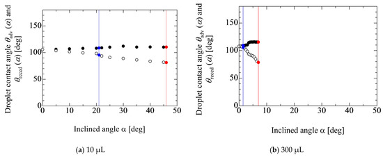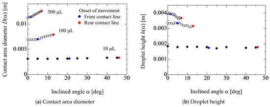 Figure 3 shows the relationship between the inclined angle α, contact area diameter D(α) and the height h(α) of water droplets. The droplet volumes are 10, 100 and 300 μL. In this figure, blue and red points represent the onset of movement of the front and rear contact lines (FCL and RCL), respectively. From Figure 3a, it can be seen that D(α) increases after the front contact line starts to move. On the other hand, in Figure 3b, the droplet height h(α) decreases as α increases. The critical inclined angle where each contact line starts to move becomes small as the droplet volume increases. This obviously indicates that the gravitational force becomes dominant compared with the adhesion force. In fact, the gradient of dD(α)/dα increases and the relationship between D(α) and α exhibits linear as the droplet volume increases.