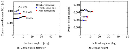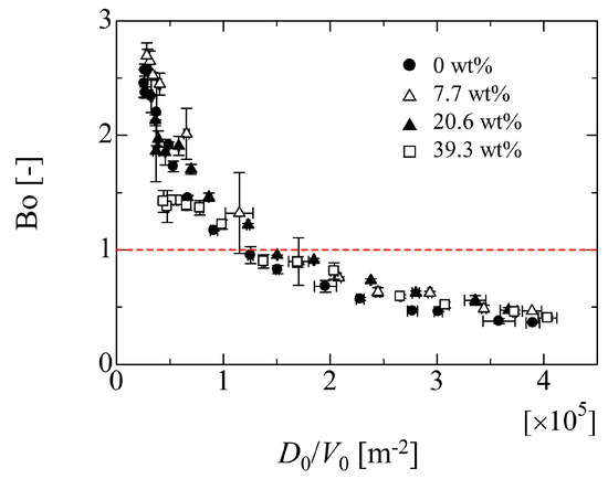 Figure 10a,b represents the images when the front and rear contact line starts to move, respectively. From Figure 10a, it can be seen that the advancing contact angle almost takes the same value as the receding one. However, in Figure 10b, the receding contact angle is smaller than the advancing one, which implies the deformation of the droplet shape. On the other hand, in the case of 39.3 wt%, as shown in Figure 11, the advancing and receding contact angles take similar values in both cases of Figure 11a,b. This means that the droplet deformation almost does not arise in the case of high ethanol concentration. From Figure 9, in addition to the result in Figure 8, at least, it can be seen that the effect of the droplet size on the adhesion force is not so significant if the value of D0/V0 is larger than 1.5 105 m−2. Here, Figure 12 shows the relationship between the bond number (Bo = ρlgh02/σlg) evaluated by the initial droplet information and D0/V0 in each liquid property. In this figure, this criterion physically means the boundary where the Bo is less than unity depicted by the red dashed line.