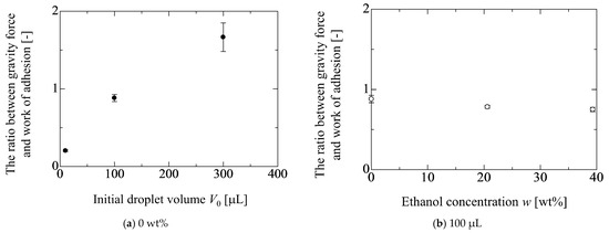 Figure 4 shows the ethanol concentration dependency of the behaviors for D(α) and h(α). The droplet volume is 100 μL. The changes in D(α) and h(α) against α in Figure 4a,b are qualitatively the same, as shown in Figure 3. For example, in Figure 3a, the critical inclined angle for the movement of the front contact line becomes larger as D(α) increases (i.e., the droplet volume increases). In Figure 4a, the timing of the onset for the movement of the front contact line becomes fast as D(α) increases (i.e., the droplet wettability increases). However, the degree of the difference in the timing is quite different between the results in Figure 3 and Figure 4. This may be understood by considering the relationship between the gravity force and the work of adhesion based on the initial droplet condition. Concretely speaking, the ratio between the gravity force per unit contact line mg/(πD0) and the work of adhesion σlg(1 + cosθ0) is considered for each liquid property. By this ratio, the behavior of the contact line is considered. Figure 5 shows the results for the ratio of two forces for each liquid property in Figure 3 and Figure 4. In Figure 5a, the ratio of two forces becomes large as the droplet volume increases, which indicates the gravity is dominant compared with the wettability. Therefore, the difference in the critical inclined angle for the movement of the front contact line (αcFCL) becomes large with respect to the droplet volume. On the other hand, from the result in Figure 5b, it is found that the wettability is dominant compared with the gravity force and the order of three values are similar. Thus, the differences in αcFCL among the three liquid properties are not so large. As to the difference between αcFCL and αcRCL (the critical inclined angle for the movement of the rear contact line), the degree of the deformation for the droplet shape may be related. Concretely speaking, from the results in Figure 4b, the change in the droplet height between the substrate inclined angles at αcRCL and αcFCL in the water case is larger than that in the cases of 20.6 and 39.3 wt%. The deformable case, such as water, easily elongates the contact area diameter. Therefore, in the non-deformable cases, such as 20.6 and 39.3 wt%, the difference between αcRCL and αcFCL is not so large compared with water. In fact, in Figure 4, the averaged values of the difference between αcRCL and αcFCL for 0, 20.6 and 39.3 wt% are 8.7, 2.5 and 2.3 deg, respectively.