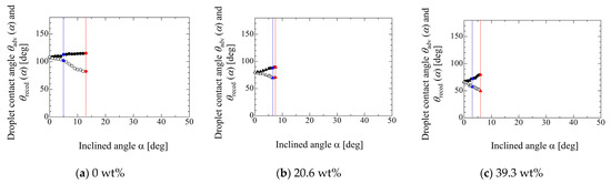 Figure 6 shows the changes in the advancing and receding contact angles during the inclination of the solid substrate. The results for water droplets of 10 and 300 μL are depicted in this figure. From these results, the gradients of |dθ(α)/dα| between the advancing and receding contact angles after the movement of the front contact line are different from each other. This may result from the fact that water exhibits a hydrophobic condition against the SR substrate, which means that the contact line is basically hard to move. In addition, the front contact line moves towards the dry surface and the rear contact line moves towards the wet surface. These conditions may induce the difference in the gradients. Figure 7 shows the effect of the liquid property on the changes in the contact angles. The mass concentrations of ethanol are 0 wt%, 20.6 wt% and 39.3 wt%. The droplet volumes are the same at 100 μL in each case. In the cases of 20.6 wt% and 39.3 wt%, the gradients of |dθ(α)/dα| between the advancing and receding contact angles are similar to each other. This may result from two cases that are relatively hydrophilic against the solid surface, which indicates that the contact line is easy to move. Therefore, it was thought that the difference in the surface conditions, such as wettability, in these cases does not strongly reflect to the differences in the gradients of |dθ(α)/dα|.