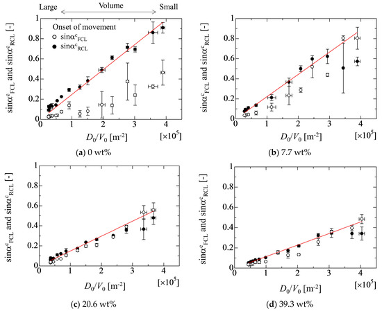 Relationship between critical inclined angles of sinαcFCL and sinαcRCL and D0/V0 in each liquid property.