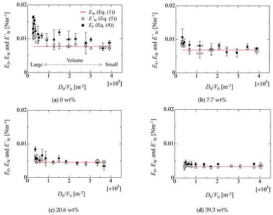 Figure 9 shows the droplet size dependency of the adhesion forces in each liquid property. The red solid line indicates the adhesion force of EW evaluated by the linear fitting approach. Here, the estimated values of EW are 7.7 10−3, 6.8 10−3, 4.5 10−3 and 3.3 10−3 Nm−1 for 0 wt%, 7.7 wt%, 20.9 wt% and 39.3 wt%, respectively. The open and solid circles represent the adhesion forces of EF and EW’, respectively. The results indicate that the values of EW’ and EF in the case of 0 wt% deviate from the value of EW as the droplet volume increases. In Figure 9a, the experimental data of EW’ and EF largely deviate from the linear line of EW as the droplet volume increases. On the other hand, the deviation of EW’ and EF from EW gradually decreases as the ethanol concentration increases. In the case of 39.3 wt%, the values of EW’ and EF almost coincide with EW. This volume effect on the adhesion forces may result from the deformation of the droplet shape due to the gravity. The cases from the case (b) to case (d) are basically hydrophilic condition against the SR solid substrate. This means that the droplet height is low and the center of gravity is close to the solid surface. On the other hand, case (a) displays hydrophobic conditions. The center of gravity is far from the solid surface compared with the hydrophilic one. Therefore, the droplet shape easily deforms due to the gravity force in the hydrophobic case.