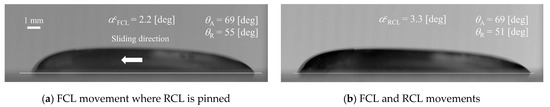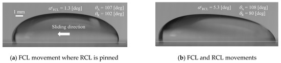 In Equation (2), cf, lwidth, σlg, θR and θA represent the pre-factor, the width of the contact area of the droplet, the surface tension between liquid and gas and the receding and advancing angles, respectively. Equation (2) reduces to the original Furmidge’s model when the pre-factor cf takes unity. In recent models, there are some expressions for the pre-factor cf where the Laplace pressure and the parameter for the pinning force are considered [16,34]. However, there is no consensus for the expression of the model. Therefore, the present study mainly focusses on the classical relations of the WF and the original Furmidge’s models, as mentioned in the next section, and the pre-factor is discussed in Section 4.3. In a previous study [35], it was revealed that the value of lwidth is almost constant, which is the same as the initial droplet contact area diameter D0 until the onset of the droplet sliding. Therefore, in the present study, lwidth in Equation (2) is treated as D0.