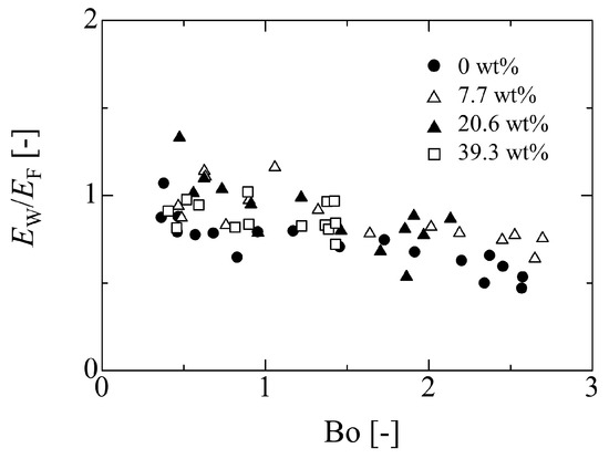 Since the result for Bo in Figure 12 exhibits a similar trend in Figure 9, the ratio EW/EF may be related to Bo. In particular, from the expression of Equation (2), the ratio EW/EF indicates a pre-factor cf and means the factor which corrects EF to EW if the constant EW is thought as the adhesion forces between liquid and solid. From the results in Figure 9 and Figure 12, a simple relationship can be deduced as follows: