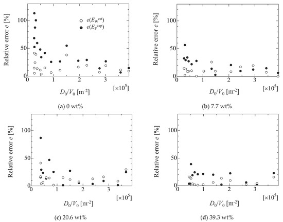 In the figure, the values of EFexp and EWest are substituted into E in Equation (7), and the white and black circles represent the relative error of e(EWest) and e(EFexp), respectively. The estimated values of EWest by Equation (6) shows relatively good agreement with the linear fitting value of EW; for example, the relative error for EFexp becomes large as the droplet volume increases in each liquid case. On the other hand, the relative errors for EWest are smaller than that that for EFexp. This indicates that the size effect of the droplet on the adhesion force can be well correlated by the simple linear relation of Equation (6). In fact, it is reported that the pre-factor cf in Equation (2) is related to the size of the droplet [32,33]. However, there is a large discrepancy for the water case in the case of the large droplet. In the water case, the deformation of the droplet is larger than that of other cases. This might relate to the lack of the consideration for the physical conditions, such as a force balance at the contact line and the effect of the droplet surface shape on the adhesion force. Concretely speaking, the models mentioned in the Section 2 are mainly the retention force in the horizontal direction at the contact line. However, forces such as the vertical force at the contact line and the Laplace pressure of the droplet surface are also important factors to determine the droplet conditions. Therefore, such factors must be considered in Equation (6) from a comprehensive point of view in the future.