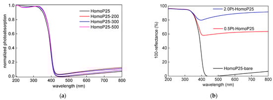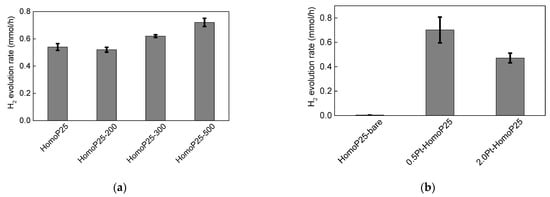 The photocatalytic activity of all samples was investigated for methanol dehydrogenation reaction. Since titania is hardly active for gas evolution reactions (both hydrogen and oxygen), because of high overpotential, a metallic co-catalyst is commonly used. Here, platinum was in-situ deposited during activity testing on the surface of pristine titania samples, and obtained results are shown in Figure 6a. Although, similar activities were obtained for HomoP25 and HomoP25-200, the higher annealing temperatures used for the samples’ preparation cause an acceleration of photocatalytic activity, which could be caused by the formation of larger particles or slight surface modification (as observed by XRD and XPS data—an increase in NC content and enhanced oxygen adsorption, respectively). Prieto-Mahaney et al. compared the properties and photocatalytic activities of 35 different titania photocatalysts, finding that an increase in particle size is beneficial for hydrogen evolution []. The enrichment of titania surface with oxygen could also be profitable for facilitating platinum adsorption, e.g., platinum encapsulation by an amorphous TiOx cover layer in an oxidative atmosphere []. In Figure 6b, the activities of Pt/TiO2 samples were compared to the activity of original titania (without in-situ deposition of Pt). Indeed, bare titania is almost inactive for hydrogen evolution, and metallic co-catalyst has increased titania performance by more than one order in magnitude (ca. 20 and 13 times for 0.5Pt-HomoP25 and 2.0Pt-HomoP25, respectively). Moreover, a lower content of platinum shows to be better, which is directly connected with the “shielding” effect, i.e., a decrease in photoabsorption by titania (competing with platinum for photons), as previously reported for optimized conditions of hydrogen evolution on platinized titania [,].
