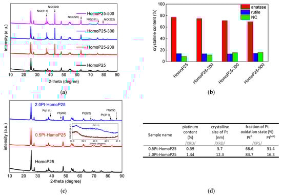 The presence of anatase and rutile is clearly observed in XRD patterns of all samples, together with a standard (NiO), used for the determination of NC content, as shown in Figure 2a. With an increase in annealing temperture, the crystalline properties have slightly changed, as clearly shown in Table 2 and Figure 2b. As expected, the desposition of platinum on the surface of titania has not changed its properties (Figure 2c). The small platinum peaks could be observed in 2.0Pt-HomoP25 at ca. 39.8°, 46.2°, 67.5°, 81.3° and 85.7°, corresponding to (110), (200), (220), (311) and (322) planes, respectively. The properties of platinum deposits, estimated from XRD and XPS analyses, are summarized in Figure 2d. Since platinum photodeposition on the titania surface is usually very fast (reaction completion within several minutes), it commonly results in the aggregation of formed platinum nanoparticles (NPs) [,,]. Accordingly, larger content of platinum used for photodeposition causes the formation of its larger NPs.