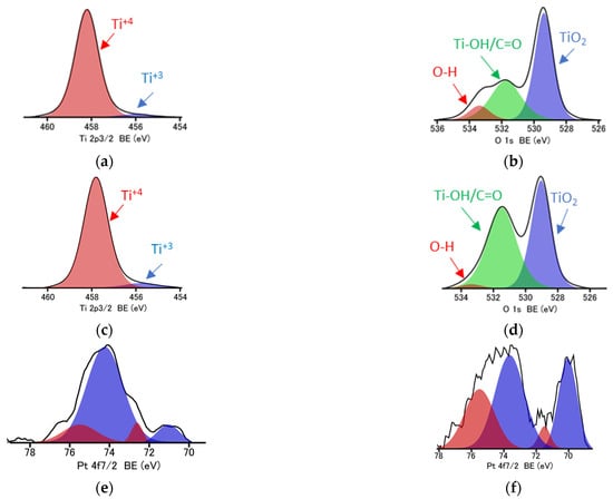 Then, surface properties of samples were investigated by XPS analysis, and obtained data are shown in Table 3 and Figure 2d and Figure 3. Interestingly, the annealing causes the significant enrichment of the photocatalyst surface with oxygen, changing the O/Ti ratio from 2.6 to 2.9, 2.9 and 3.7 when treated at 200 °C, 300 °C and 500 °C, respectively. Accordingly, it might be concluded that an increase in the content of the NC phase after annealing could be caused by enhanced adsorption of oxygen-based compounds on the titania surface, e.g., water, air and carbon dioxide. Indeed, the deconvolution of oxygen peak confirms that the content of oxygen bound to the surface (not lattice TiO2) has increased significantly, i.e., from 34.6% to 51.7% when HomoP25 sample was annealed at 500 °C, as shown in Figure 3. Moreover, the slight increase in the content of reduced titanium (Ti3+) is observed in all annealed samples. Lira et al. have proposed that an excess charge (Ti3+) could be withdrawn from the titania lattice to oxygen species on the surface and Ti interstitials could react with O adatoms upon heating []. In the case of platinum, despite the fact that zero-valent platinum (blue parts in Figure 3e–f) is formed during photodeposition (strong reductive conditions), its surface oxidation results in the co-participation of both positively (red parts in Figure 3e–f) and zero-valent charged platinum (metallic core and oxidized shell), as already reported for other Pt/TiO2 samples [].