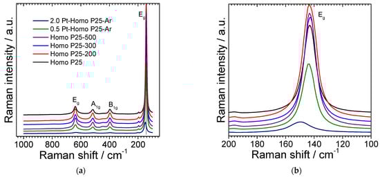 Next, Raman spectra were recorded for all samples (Figure 4). The typical features of the anatase could be clearly observed with the bands at 144 (Eg), 399 (B1g), 513 (A1g) and 639 cm−1 (Eg). The shift of the main vibrational mode peak to higher wavenumber after titania modification with platinum is typical and commonly reported for titania samples modified with noble metals (Au, Pt, Pd) [,,,,]. It was proposed that broadening and blue shift of peaks could be caused by an increase in the content of defects (e.g., oxygen vacancies, causing the titania lattice to shrink and, thus, shortening the length of the Ti-O bond) [,] and/or substitution of titanium (Ti4+) by metal (e.g., Cu, Fe and Mn []). However, it was also proposed that platinum could repair the rupture of the Ti–O bond and, thus, reduce the blue shift of Raman peak (though in all Pt-modified samples, the blue shift was observed in comparison to the original titania) []. Interestingly, there are also contrary reports showing the red shift of the titania peak after modification with platinum resulting from the growth of particle size (during synthesis) []. Nevertheless, the shift of the main peak is commonly reported for titania modified with noble metals, and thus, indirectly confirms the metal presence on the surface of the photocatalysts. Moreover, the significant drop in the relative band intensities also denotes the surface modification with platinum. The noble metal atoms typically disrupt the crystal symmetry of the titania lattice, and thus, significantly impact the lattice vibrational modes of the host.