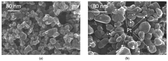 Interestingly, the lack of activity of platinum could be caused by high adsorption capacity for Pt by Aspergillus fungi, which has even been proposed as a method for the removal of metals (including heavy metals) from the environment []. To our knowledge, there are no studies on the application of Pt-modified titania for the removal of mold fungi. In contrast, nitrogen-, fluorine-, gold- and silver-modified titania samples exhibit superior antifungal activity against Fusarium oxysporum and Penicillium chrysogenum [,,]. Additionally, the synergistic effect between silver and cupric oxide, deposited on the surface of titania, was reported for Penicillium chrysogenum and Aspergillus melleus []. However, the antifungal effect was stronger in the dark than under irradiation and only significant for specific ratio between components (i.e., 1:3 of Ag to CuO).