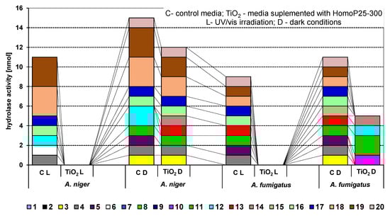 The activity of 19 hydrolases secreted by A. niger and A. fumigatus fungi growing on control media and supplemented with 20 g/L HomoP25-300 under UV/vis irradiation and in the dark.