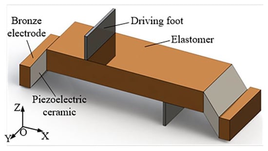 The cross-section of PZT ceramics is a parallelogram, and it is polarized in the Z-axis direction. An isotropic eccentric constraint is applied to the motor by the oblique piezoelectric ceramic, which causes a coupled L1-B2 vibration mode to the elastomer. In reaction to the oblique electric field, the oblique piezoelectric ceramic produces both longitudinal and bending vibrations. The longitudinal vibration of the ceramic excites the longitudinal vibration component of the L1-B2-coupled mode, and the bending vibration of the ceramic excites the bending vibration component of the L1-B2-coupled mode, resulting in an oblique linear motion of the driving foot to drive the load.