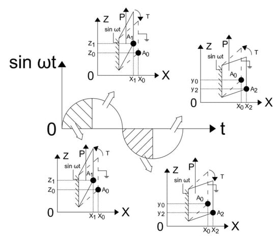 From t = 0 to t = π, the PZT ceramic contracts in the direction of the X-axis and twists in the positive direction of the Z-axis. When t ∈ (0, π/2), the lower right endpoint of the PZT ceramic moves from point A0 to point A1 (x0–x1, z0–z1); when t ∈ (π/2, π), the lower right endpoint of the PZT ceramic moves from point A1 to point A0 (x1–x0, z1–z0).