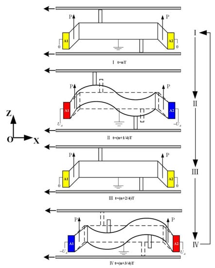 PZT ceramics in the motor are pasted at two ends of the stator. Take one vibration period of a piece of PZT ceramic as an example, and its vibration deformation is shown in Figure 2.