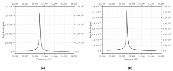 The top points of the driving feet on the upper surface were selected as the observation points of the harmonic response analysis, and the obtained amplitude–frequency relationships are shown in Figure 7. When compared, the X and the Z directions basically overlapped and had equal resonant frequencies. From the observation of the analysis results, it can be seen that when the frequency was 23.9 kHz, both the two directional curves and the amplitude–frequency response curves of the driving feet in the X directional vibration amplitudes of the motor-driving feet were extremely large. It was determined that the excitation scheme for the motor to produce the demand coupling mode was 23.9 kHz.